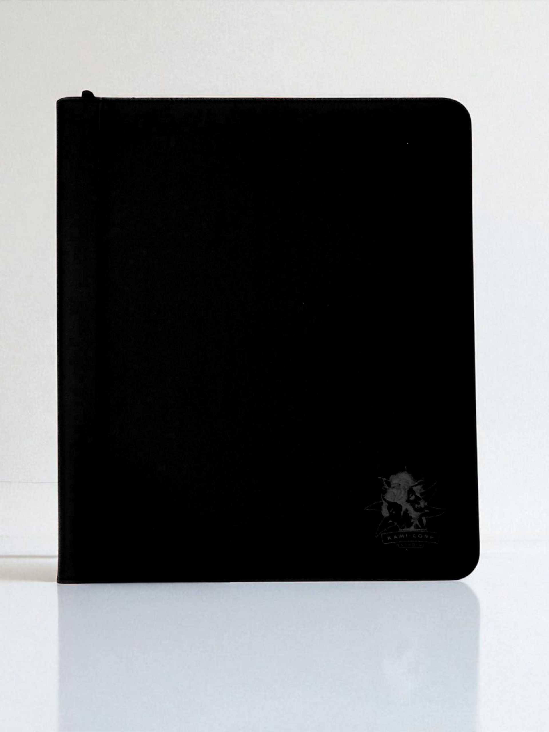 Couverture rigide, fermeture à zip, intérieur noir.